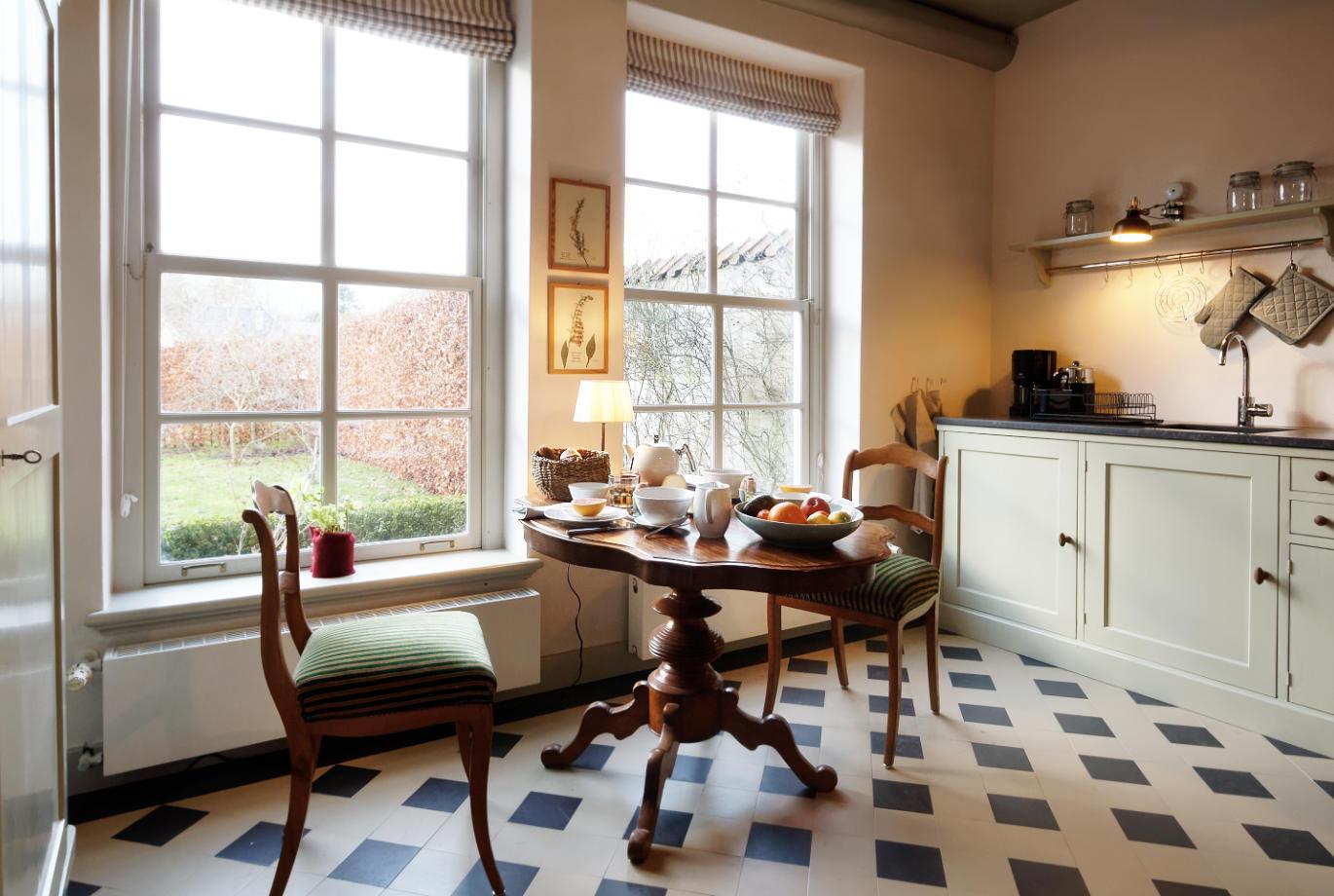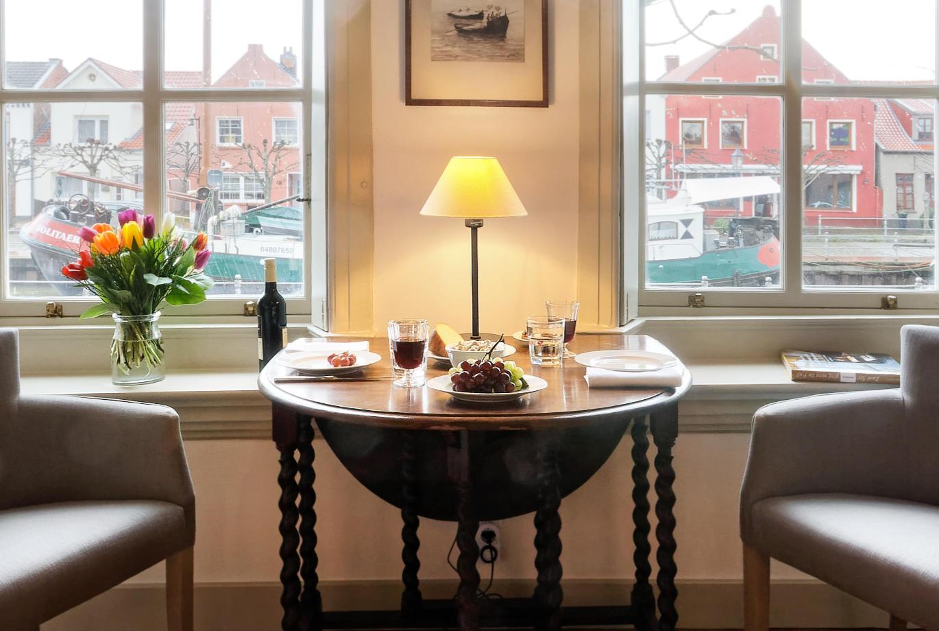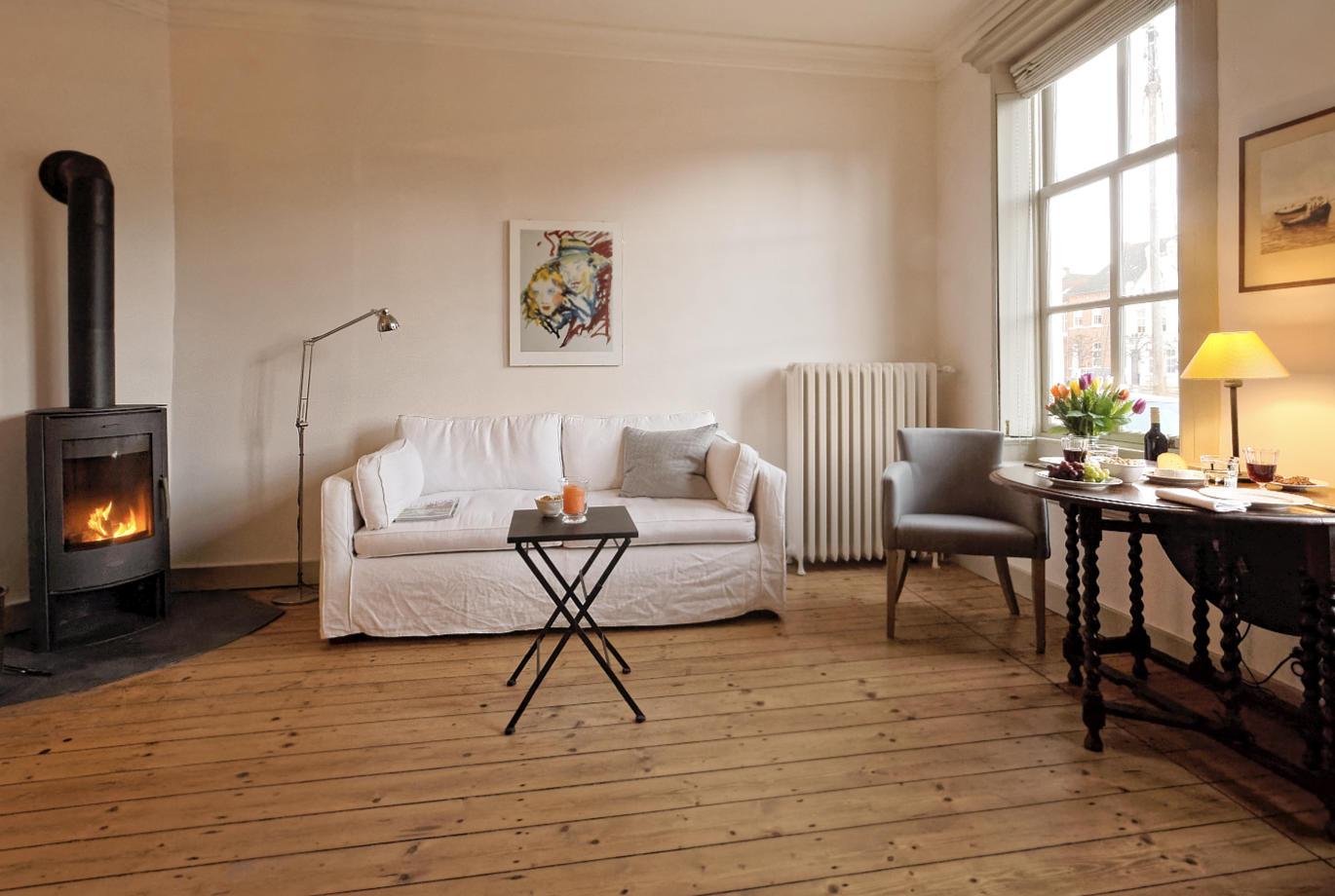 Die Ferienwohnung "Zarah" für 2 Personen wird über die mittige Haupteingangsür getrennt erschlossen. Über eine kleine Eingangsdiele mit Garderobe gelangt man rechts in das Wohnzimmer mit einem Kaminofen. Aus dem Wohnzimmer hat man einen sehr schönen Blick auf den alten Hafen. Links von der Eingangsdiele liegt das Schlafzimmer mit Doppelbett. Hinter dem Schlafzimmer befindet sich eine geräumige, sehr sonnige Wohnküche mit Blick über 2 große Schiebefenster in den schönen Garten. Der Garten ist über die Küche und den anschließenden Mittelgang des Gebäudes direkt zu erreichen. Das Badezimmer mit begehbarer Dusche schließt direkt an die Eingangsdiele an.